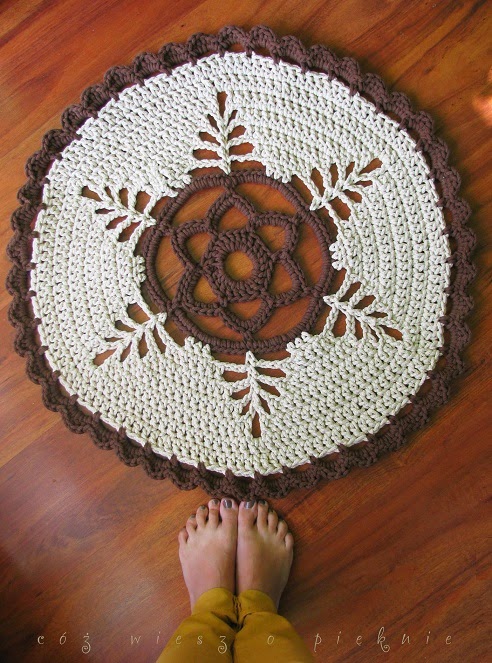 Dane techniczne :) sznurek bawełniany 5 mm, szydełko 8, dodałam dodatkowo ostatni rząd słupków, zużyłam prawie 100 m brązowego sznurka i niecałe 150 m beżowego, dywanik ma średnicę 75 cm.