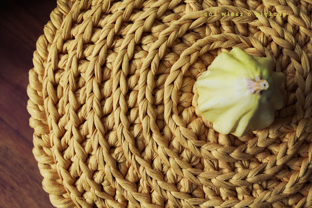 Cóż to za tytuł pomyślicie ;) Ano tytuł jest podporządkowany jednemu z moich ulubionych kolorów :) W dodatku to kolor jesieni - pięknej złotej jesieni :) Historia jest taka, że jedna z moich ulubionych rękodzielniczek :D - na pewno znacie ceramiczne cuda Ireczki z bloga W gniazdku na akacji - choć sama świetnie włada szydełkiem ;) - zamówiła u mnie poduchy - dwie, duże, okrągłe, o grubym splocie - koniecznie w kolorze musztardowym ;) i grafitowym :) Jako, że na dzierganie nowości zawsze jestem ZA zgodziłam się bez wahania ;) Ale wyniknął mały problem, bo nie mogłam nigdzie znaleźć sznurka w kolorze musztardy... :/ Hmm...więc poszukiwania trwały dalej..aż w końcu szczęśliwie znalazłam różne odcienie miodowe, musztardowe z KotToOn T-shirt Yarn w sklepie internetowym Knit.pl. Niezwłocznie złożyłam zamówienie, przesyłka znalazła się u mnie bardzo szybko, a ja bardzo szybko wzięłam się za szydełkowanie, bo ciekawość mnie zżerała jak pracuje się z t-shirt yarn, nigdy wcześniej nie miałam okazji dziergać z tej "włóczki". Powiem Wam że się nie zawiodłam, jest miła, miękka, elastyczna, wzór fajnie się układa a efekt końcowy baaardzo mi się podoba :) Na szczęście zamówiłam jeden motek więcej i wydziergam też dla siebie poduchę :)) Dobra, to może koniec gadania, i czas na złoto-miodowo-musztardowe fotki! :))) Grafit też się wplątał gdzieniegdzie, bo przecież miały być dwie poduchy ;) Ale jak zobaczycie na zdjęciach pierwsze skrzypce gra wiadomo jaki kolor... ;))